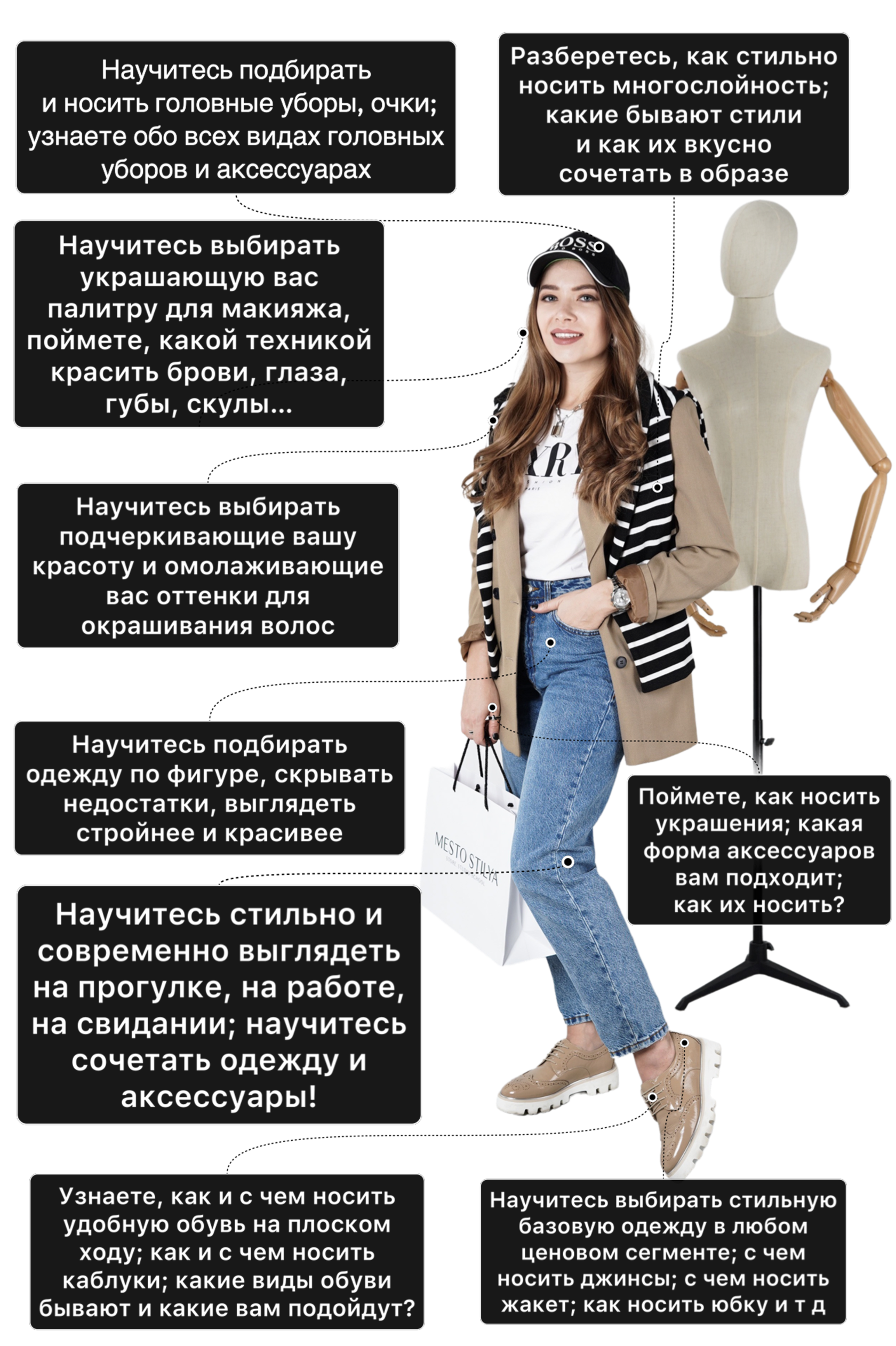 ИЗУЧИТЬ, ПОМИМО ГАРДЕРОБА, ЕЩЕ И ЦВЕТОТИПЫ, СТИЛЕВЫЕ ТИПАЖИ, АРХЕТИПЫ, ЖЕНСКИЕ СТИЛИ, ВИЗУАЛЬНУЮ КОРРЕКЦИЮ ФИГУРЫ, МОДУ И ТРЕНДЫ?